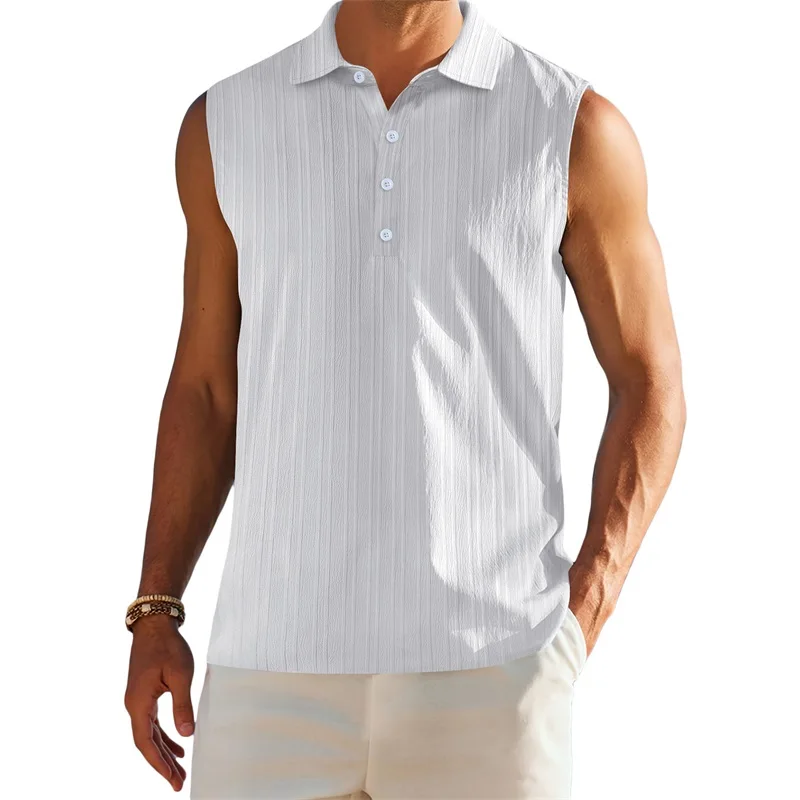 Men s Sleeveless Collared Tank Tops with Textured Stripes and Half Button-up Detail Solid Color Casual Shirts for Summer Wear
