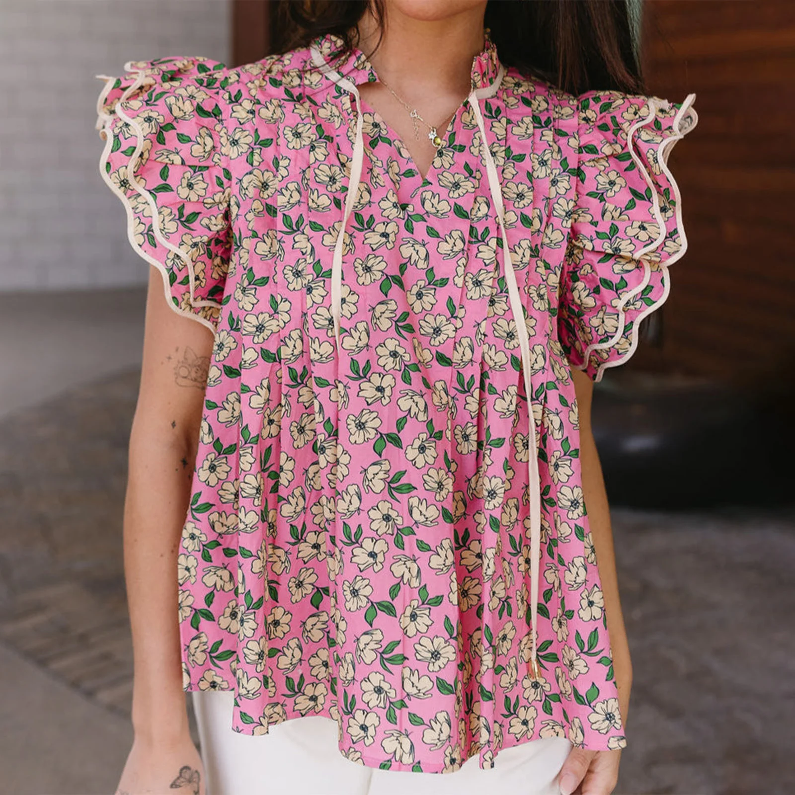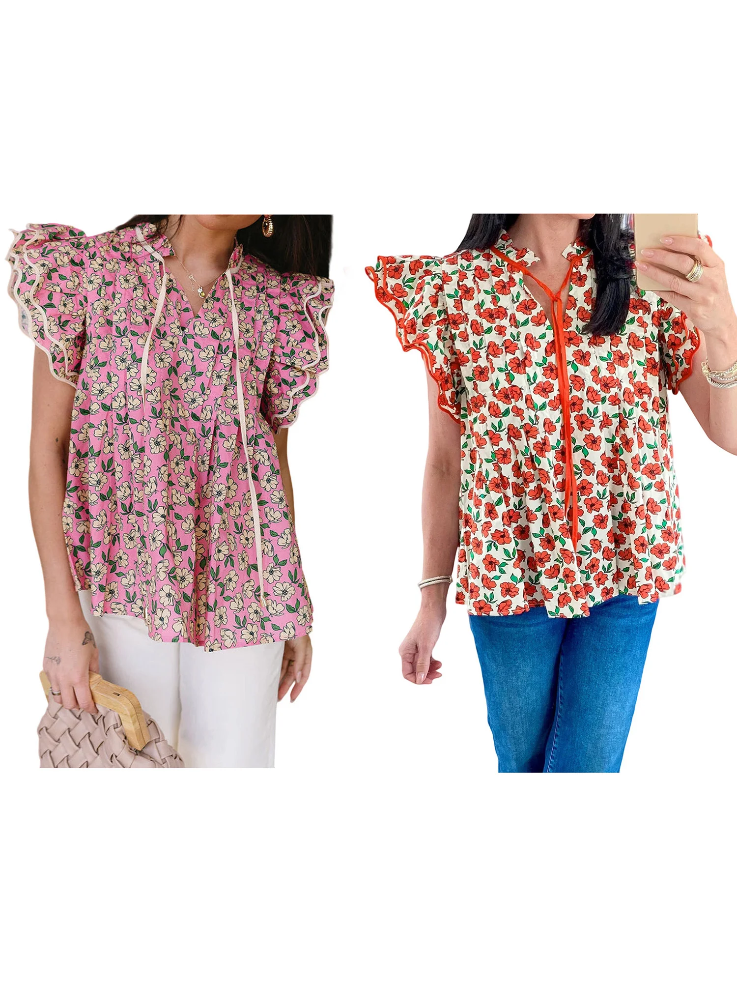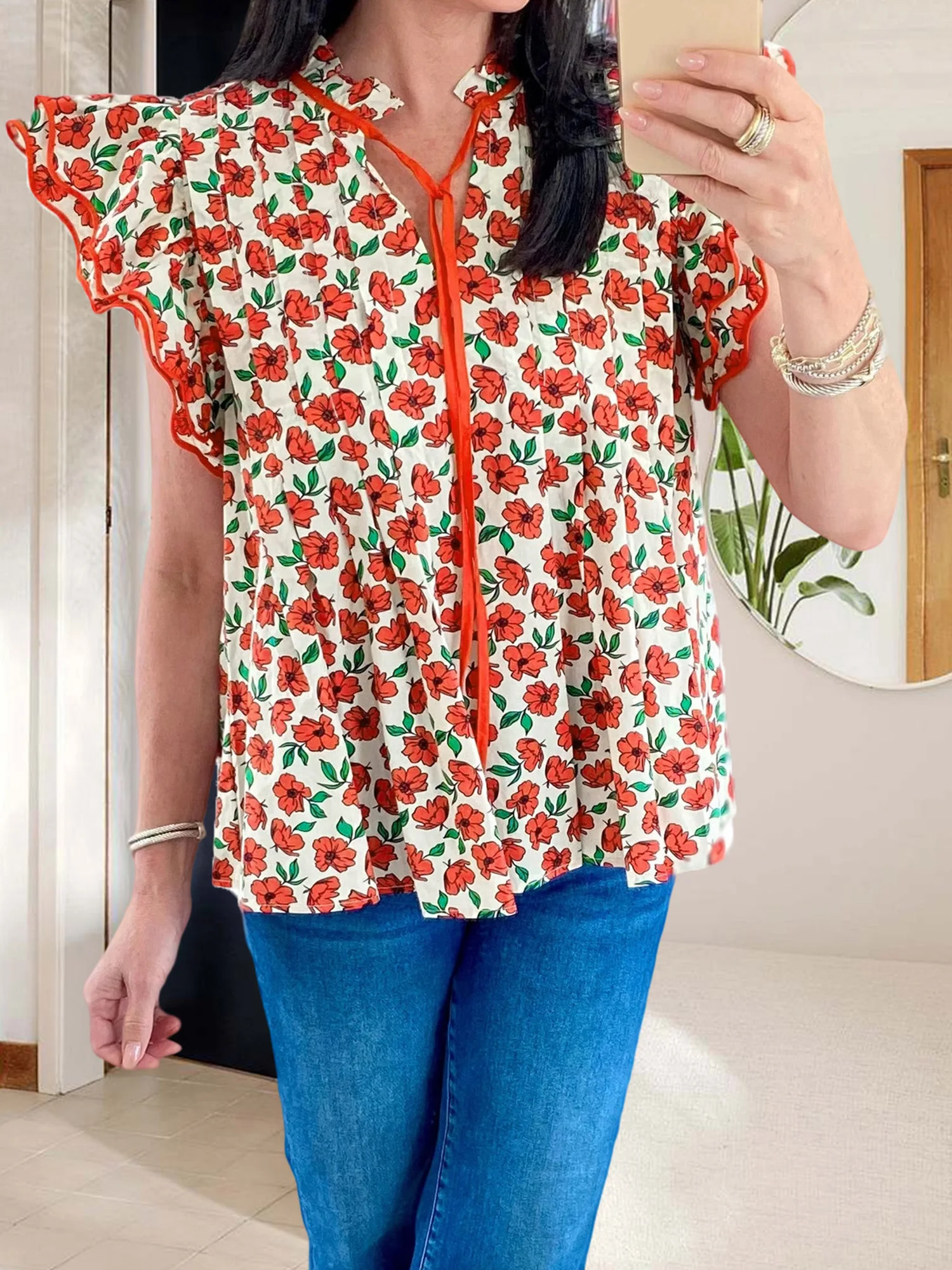 Women s Summer Casual V-Neck T-Shirt with Tie-Up Detail and Floral Print Short Sleeves Streetwear Top