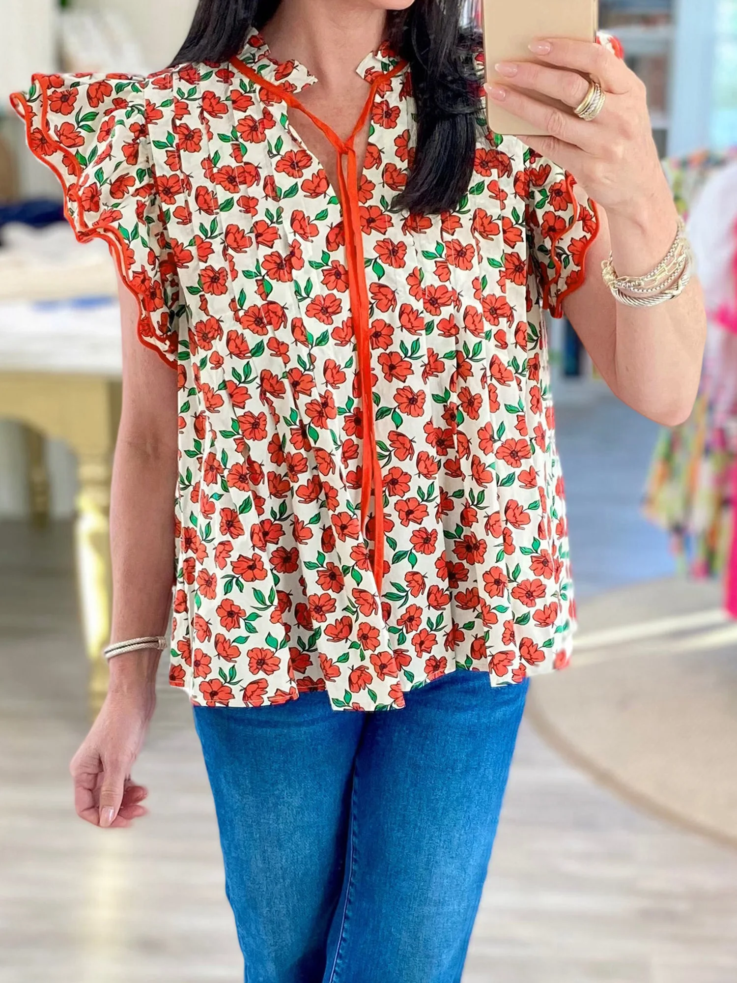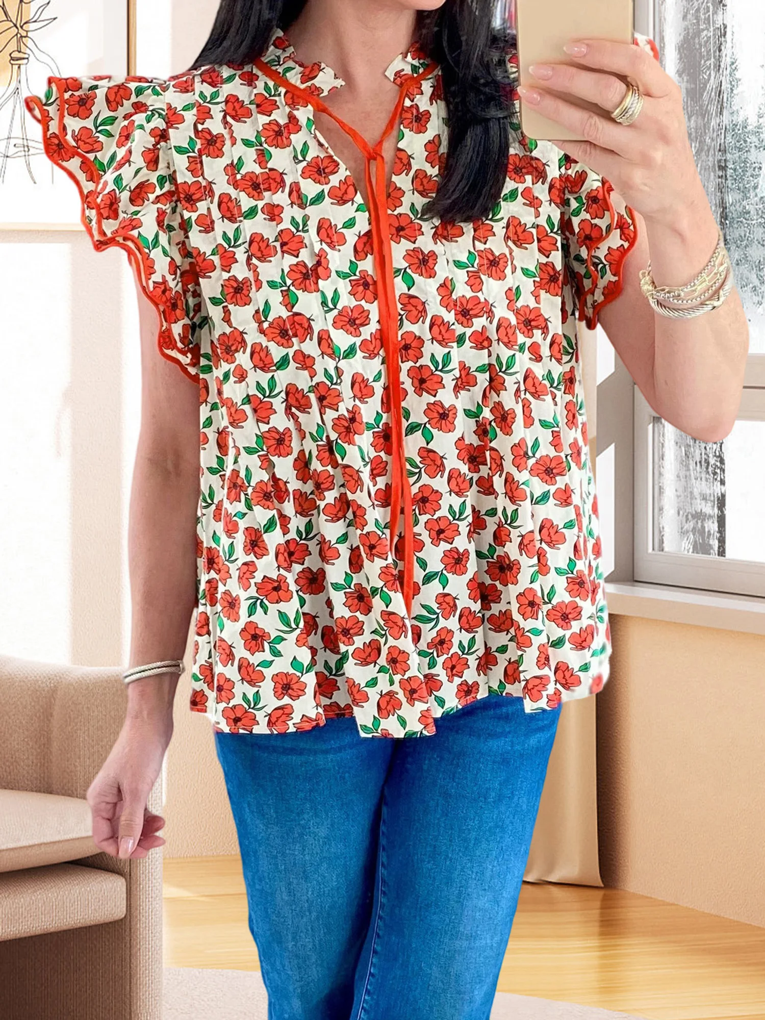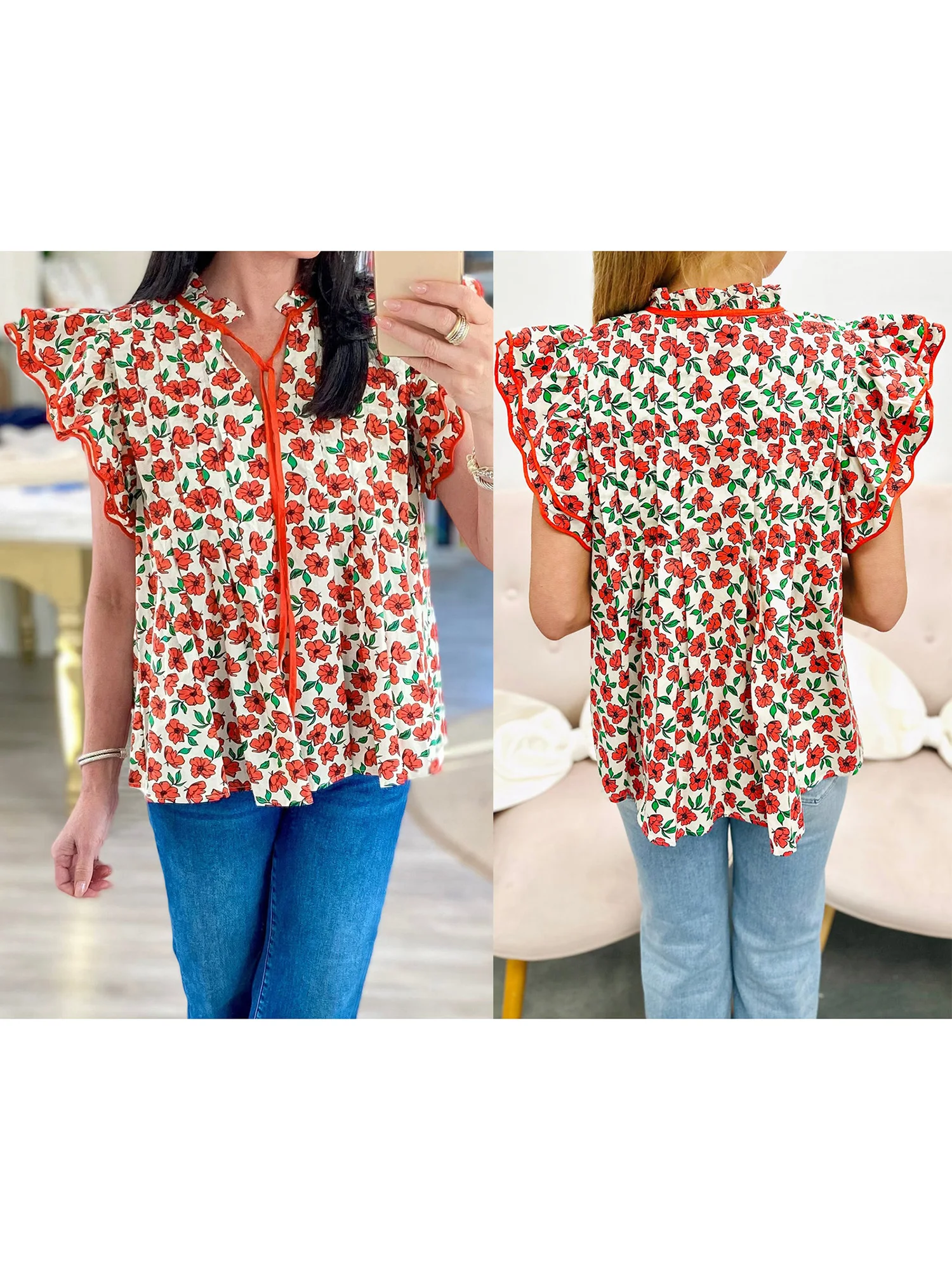 Women s Summer Casual V-Neck T-Shirt with Tie-Up Detail and Floral Print Short Sleeves Streetwear Top