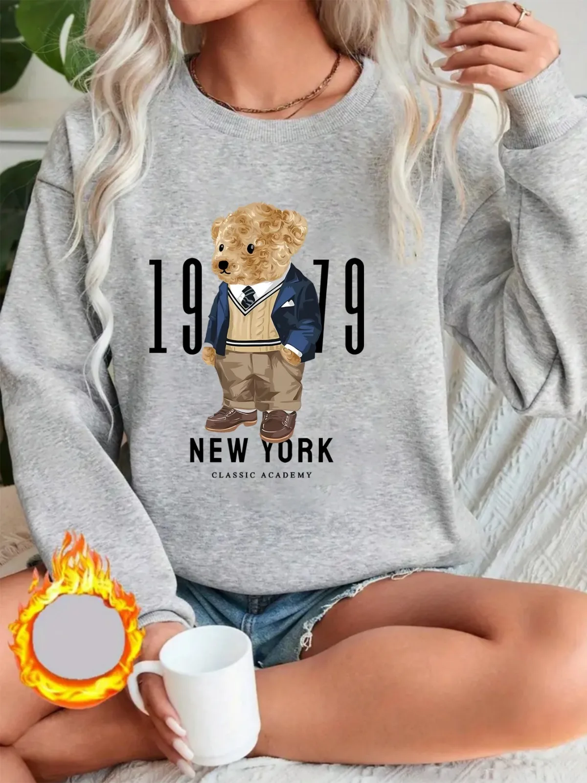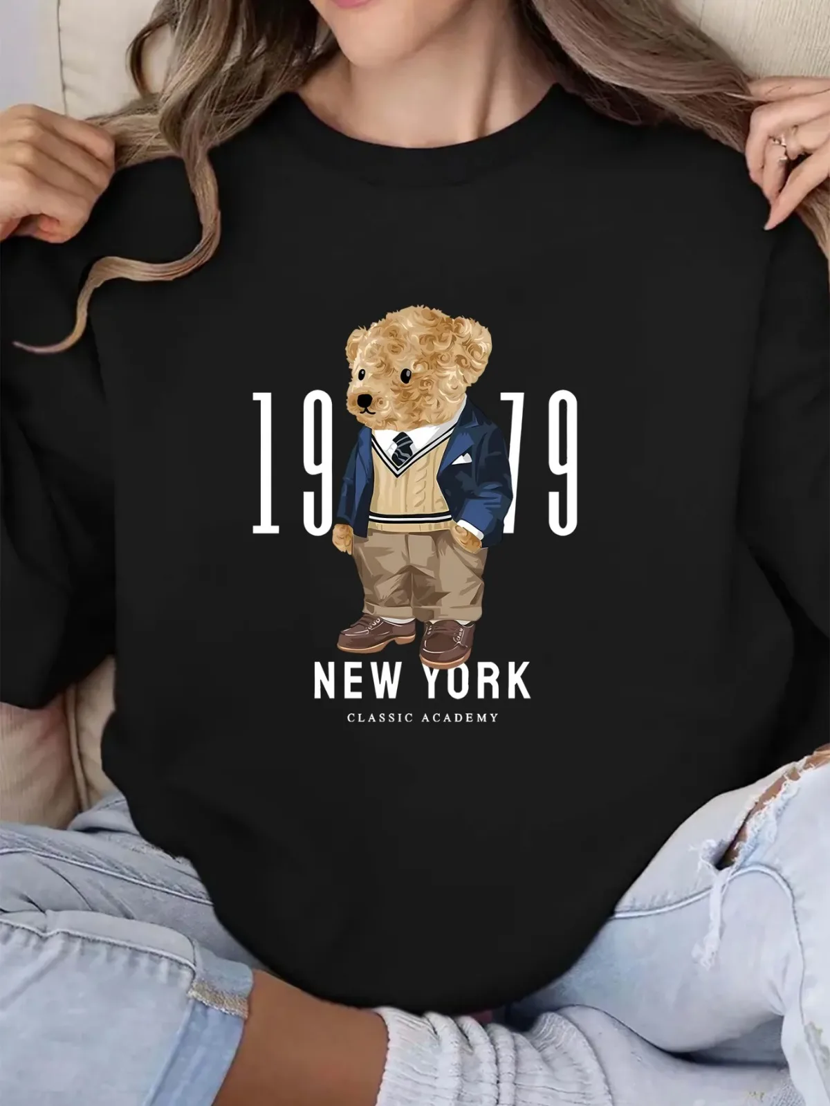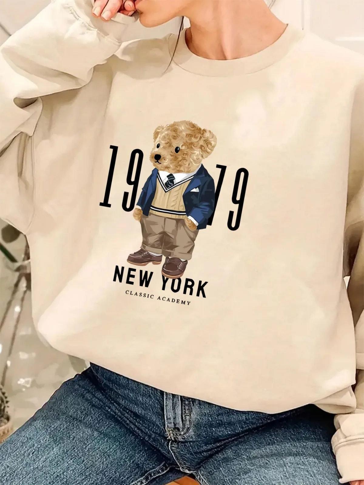 Women’s Fashion Casual Cartoon Bear Print Round Neck Sweatshirt Suitable for Parties Holidays Gift Pullovers Streetwear Women